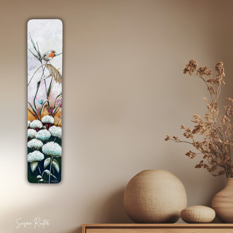 We had actually known for a long time that we wanted a painting by Susan Ruiter. We had seen several examples, but wanted a combination of those examples, with our own input. The butterfly and the robin were definitely given a place, they could not be missing. The kingfisher came from Susan herself and brought a fresh color to the whole.
