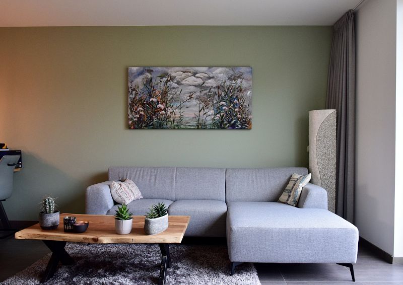 Susan came to see us to look at the colors and sizes of the painting. She really took the time to discuss everything properly. We also discussed our personal taste well. When the painting was almost finished we could go and look at the end result. We could still make minor adjustments if we wanted. A week later the painting could be hung. Susan personally brought it with her husband and helped us with the hanging. And the painting has become beautiful. It hangs in a prominent place in our room. Throughout the day, through the play of light, you see the painting in a different way every time. Enjoy it every day.