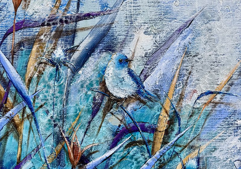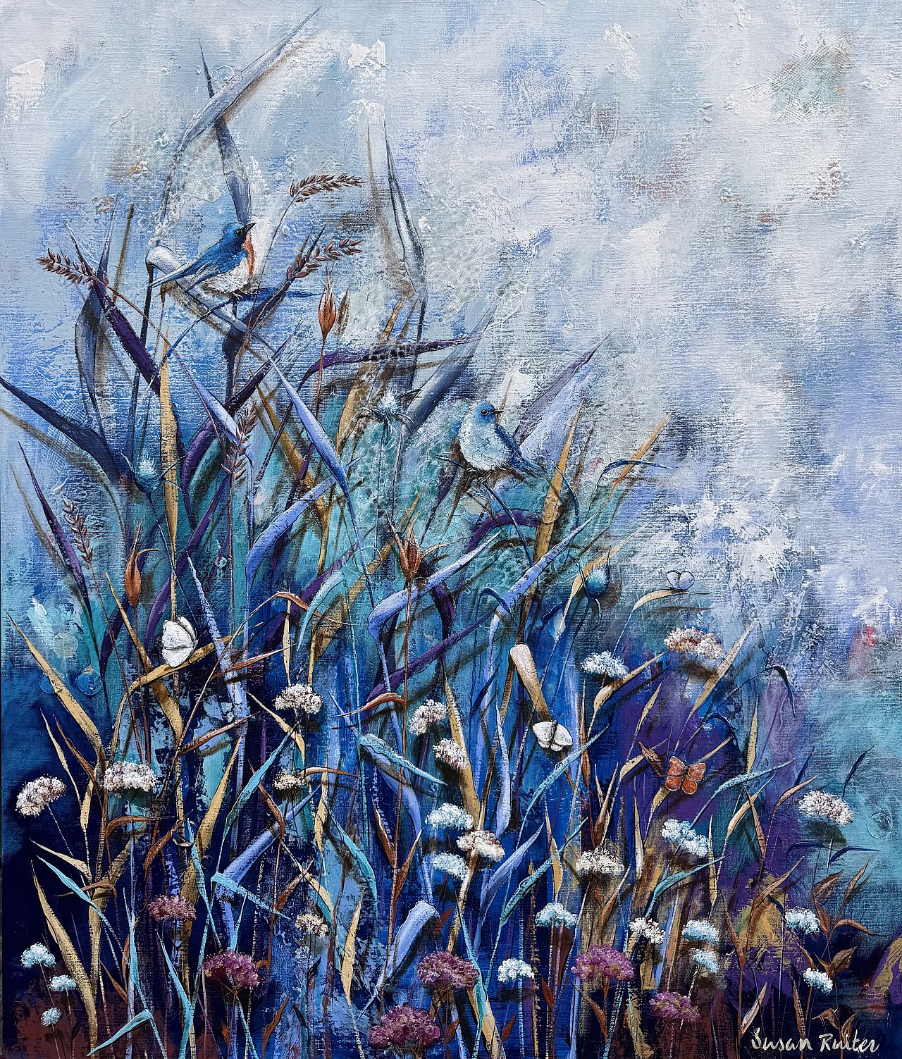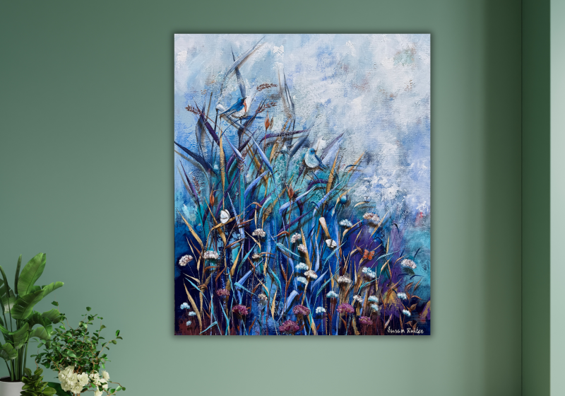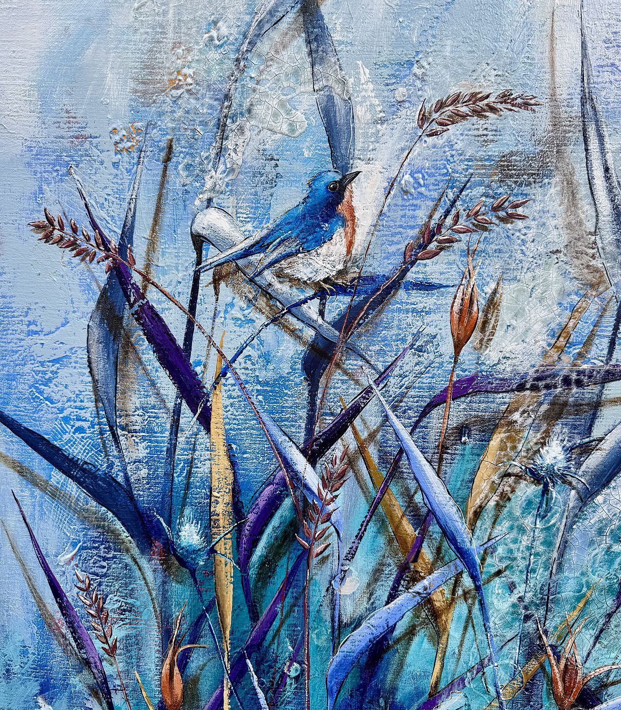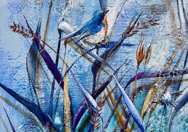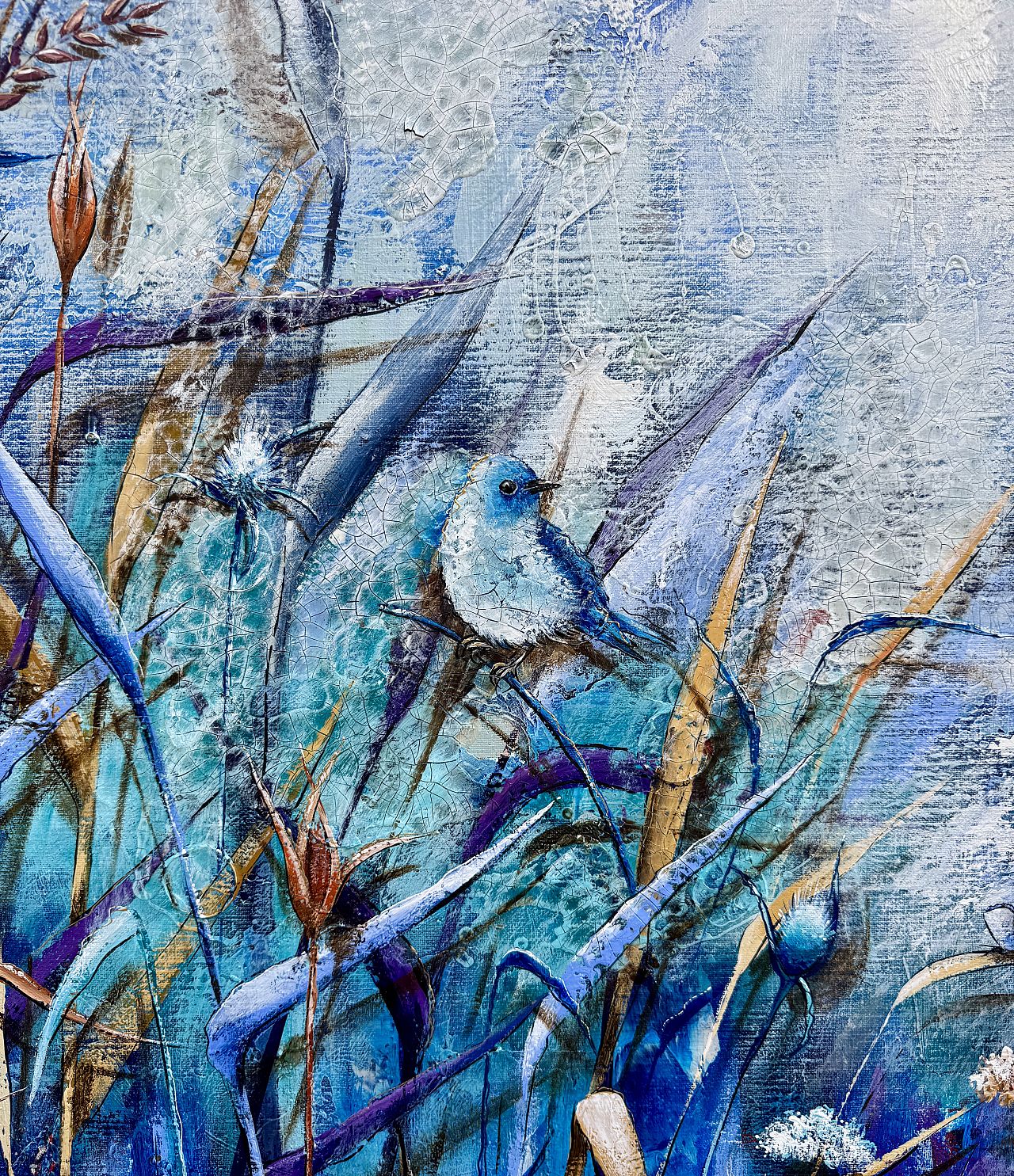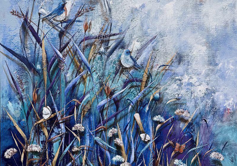 This painting captures the magic of birds and butterflies in a palette of varying blue hues. Its appearance is reminiscent of classic Delftware, but with a modern, chic twist. Every brushstroke and layering of textured materials adds depth and movement, making the work seem almost alive.