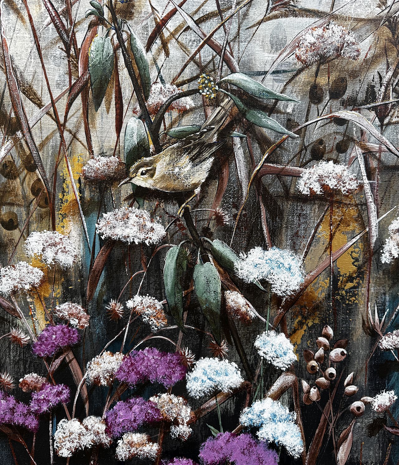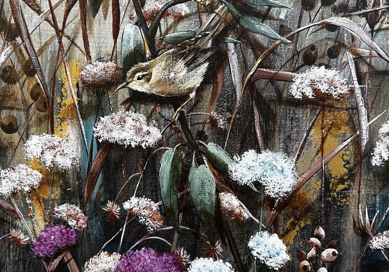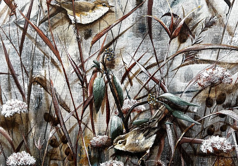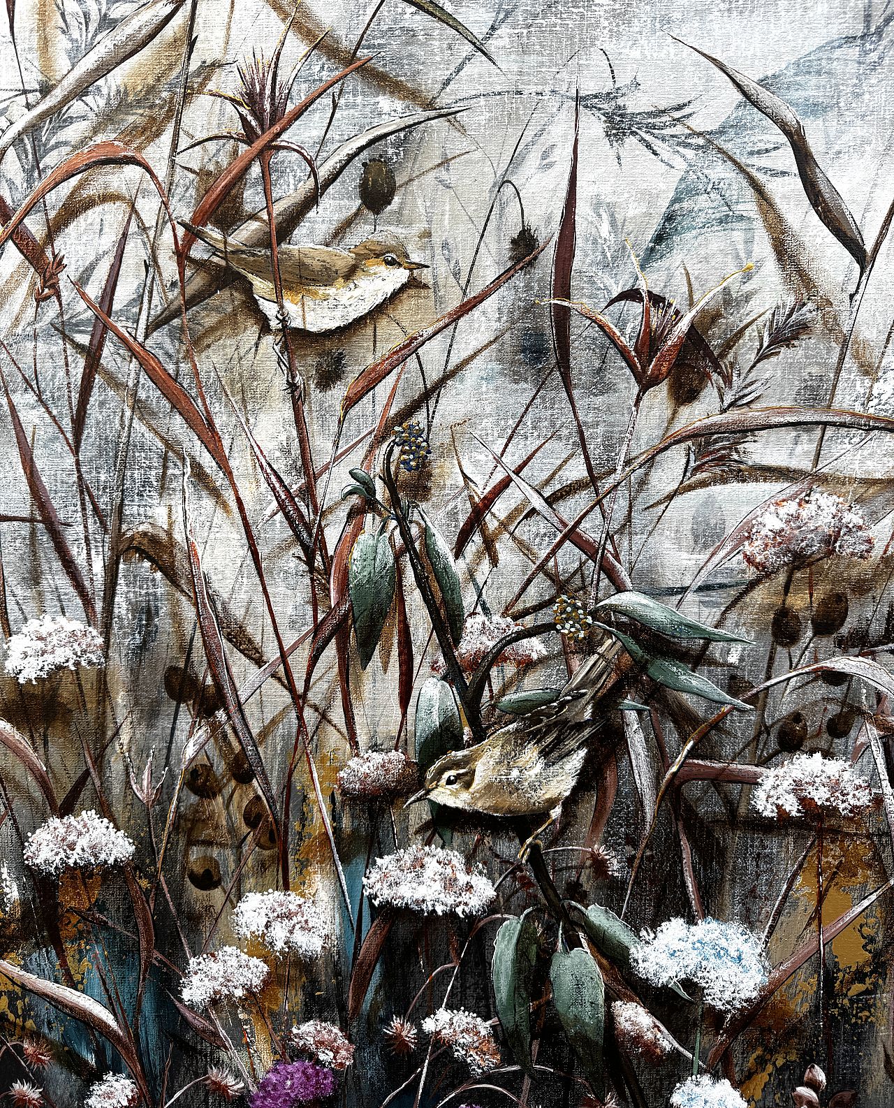 Breath of the Reeds captures that fleeting moment when nature and silence intertwine. The soft hues of gray, beige, and light blue bring tranquility and depth, while the bird's movement breathes life into the canvas.