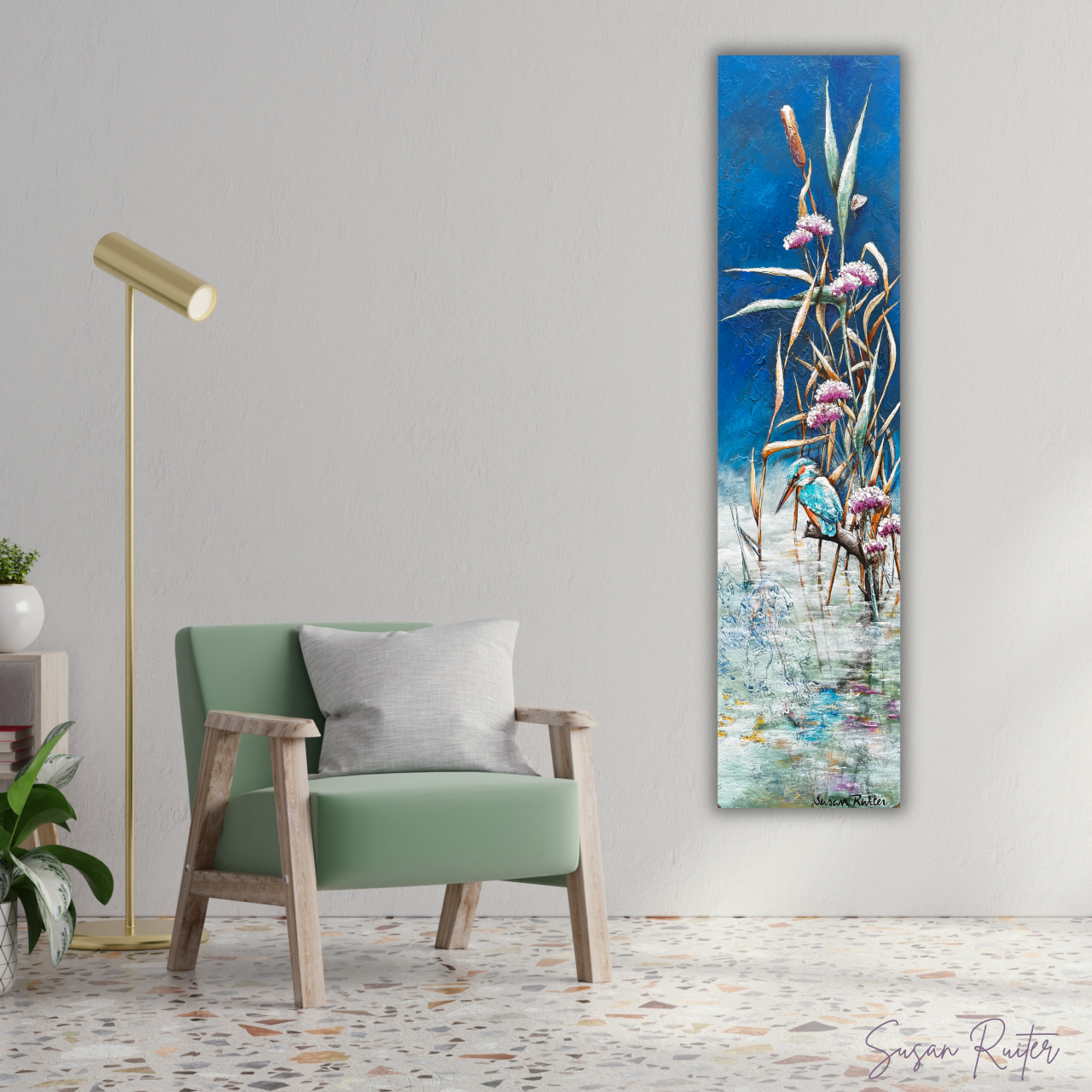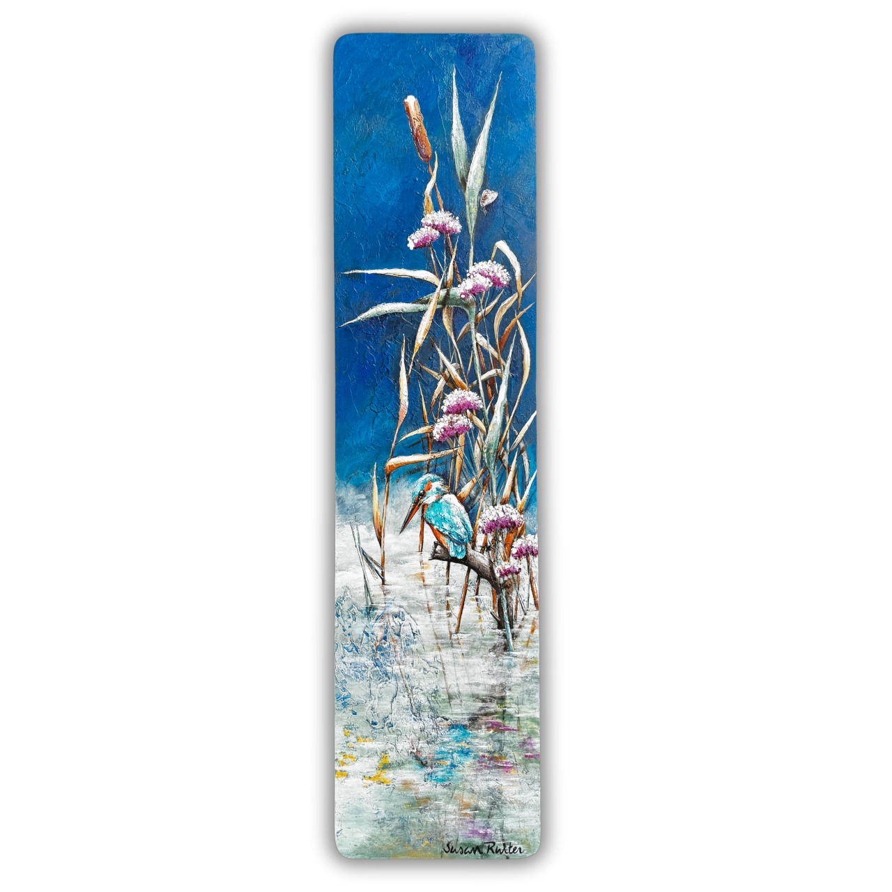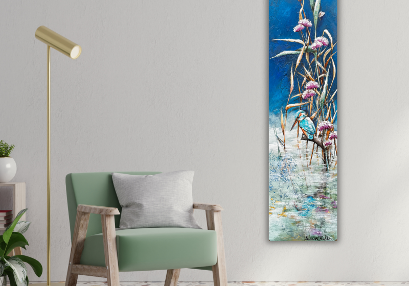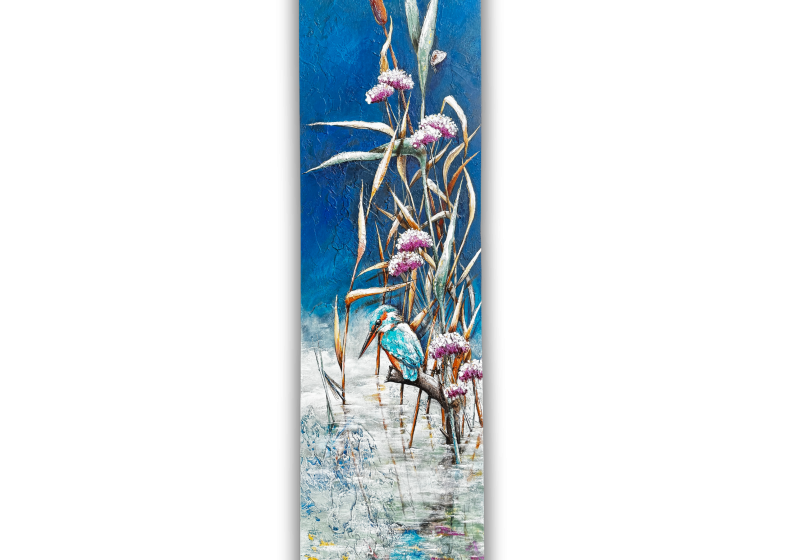 This painting, with its unique size and textured finish, is a Kingfisher painting on wood – a narrow yet tall work of art for any wall.
