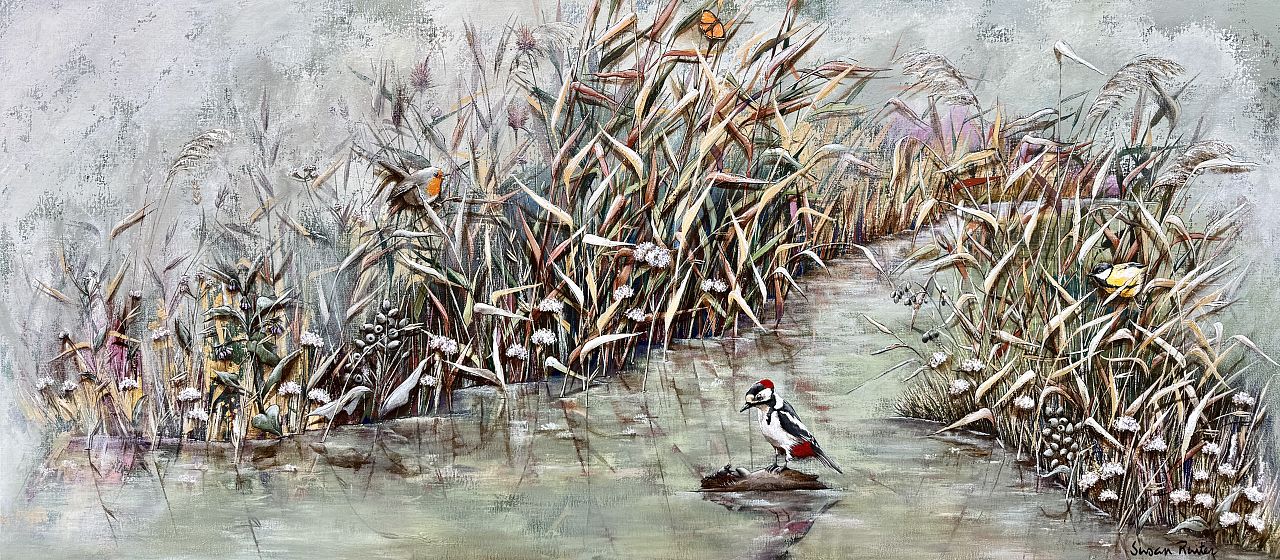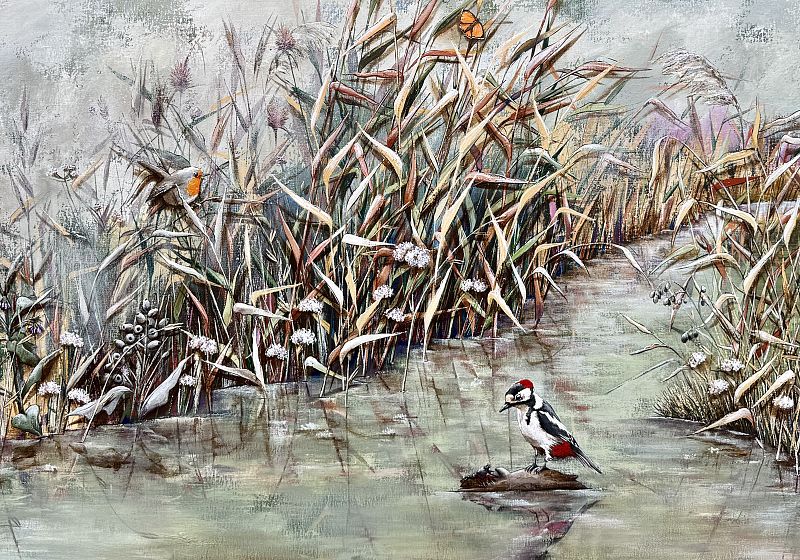 At their request, I incorporated a great spotted woodpecker, an American lobster, a robin and a great tit into the composition. While painting the reed stems and reflections on the water, I brought out the liveliness of those animals: a subtle interplay of colour and movement.