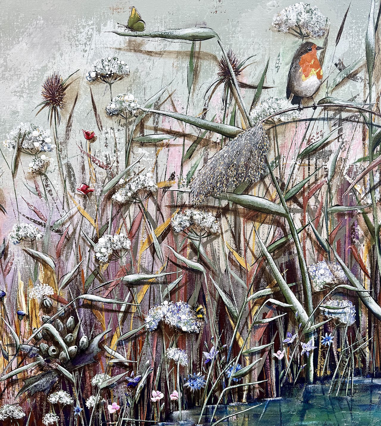 For Meriam and Jean-Paul I was allowed to work on this special assignment for a custom painting. The great thing was that a painting I was working on at that time, in terms of color and size, perfectly matched their interior. By adding their personal wishes, such as symbols for their children, the painting 'Whispers in the Reeds' was completely tailored to their vision and became exactly what they had in mind.